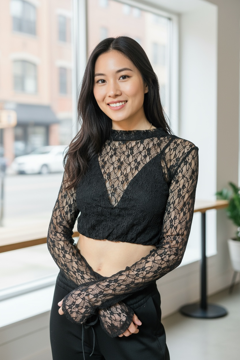 Lace Cropped Top. Black top on the inside. Long sleeves. Regular fit. Available in ONE size.